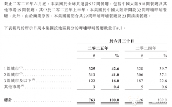 从门店规模来看,今年上半年,呷哺呷哺在全球运营937家餐厅,其中中国大陆918家,港澳台及其他市场19家,相较于去年同期减少了135家门店。其中,呷哺呷哺餐厅数量城市分布中,一线城市门店占比从39.7%提升至42.6%,三线及以下城市门店占比从22.6%降至16.0%,公司侧重区域有所体现。
