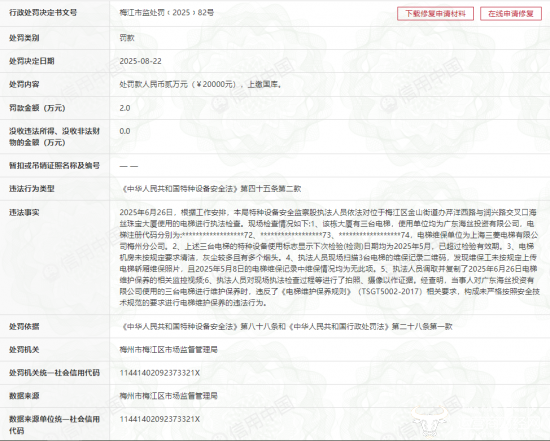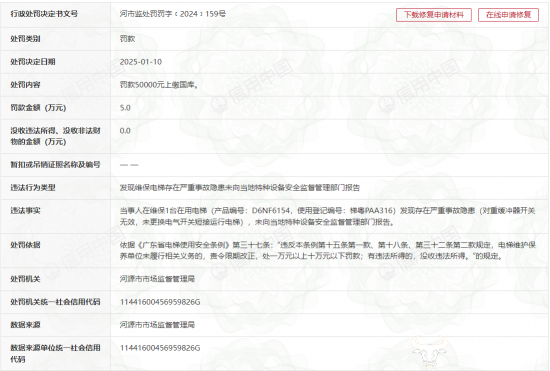 根据信用中国信息显示,2025年1月10日,该公司因“发现维保电梯存在严重事故隐患未向当地特种设备安全监督管理部门报告”被罚款五万元。