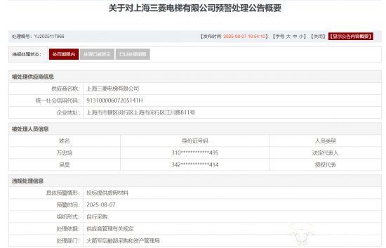 此外,上海三菱电梯有限公司本身也因在投标过程中提供虚假材料,近日被火箭军后勤部采购和资产管理局予以书面警告。