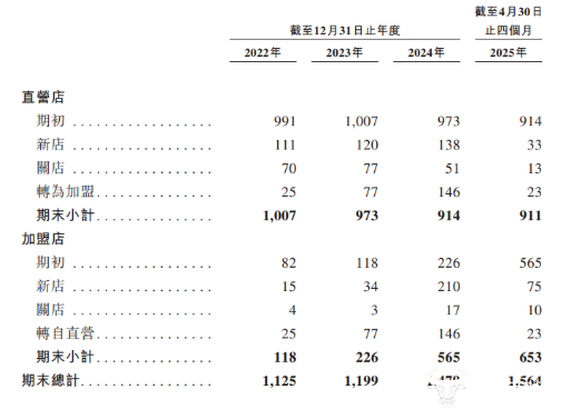 从门店规模来看,截至2025年4月底,老乡鸡在全国58个城市拥有1564家门店,其中包括911家直营店与653家加盟店。而自2022年来,直营店数量逐渐减少,加盟店数量则迅速增加,三年增长近6倍。