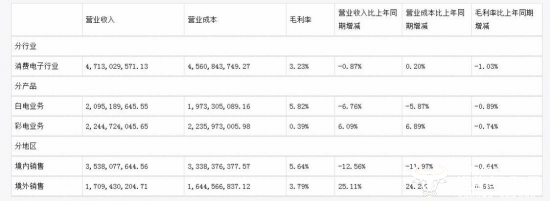 在此背景下,康佳彩电业务表现尤为突出。财务报告显示,该业务上半年实现营业收入22.45亿元,同比增长6.09%,占集团总营收52.48亿元的42.78%,超越白电业务成为公司第一大收入来源。