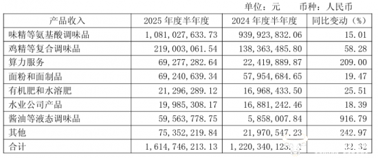 从产品来看,今年上半年,公司主营业务均实现同比增长,其中味精等氨基酸调味品实现营收10.81亿元,同比增长15.01%,依旧为公司营收主力,酱油等液态调味品实现营收5956.38万元,同比大幅增长916.79%,逐渐成为新的增长动力,鸡精等复合调味品实现营收2.19亿元,同比增长58.28%,保持稳健增长态势。