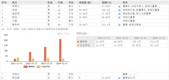 而在去年公司业绩上涨的背景下,公司高管薪酬也纷纷上涨。梅申林2024年薪酬为213.4万元,相较于2023年的138.3万元,增长了75.1万元,是公司涨薪最多的,也同样是公司的最高薪酬,远超公司其他高管,比董事长李厚文和首席执行官李斌还高。