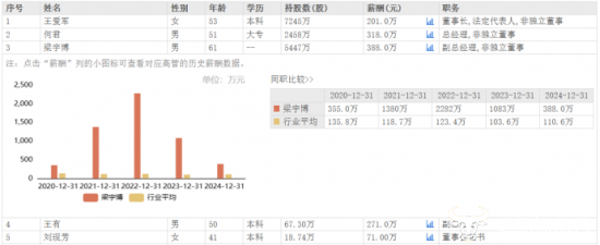 而在去年公司业绩下滑的背景下,公司高管纷纷降薪。梁宇博2024年薪酬为388万元,相较于2023年的1083万元,下降了695万元,但仍为公司高管中的最高薪酬,比董事长王爱军还高。而董事长王爱军薪酬由2023年的1226万元下调至2024年的201万元,下降了1025万元,降薪超千万元。