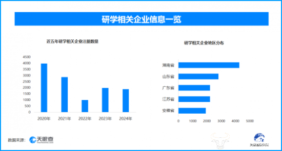 从企业年度新增注册数量趋势来看,研学相关企业在2019年达到新增注册高峰,年度注册企业达到5700余家,此后则显示出逐年下降态势,近三年来注册企业稍有回升平稳态势。另外2025年截至目前新增注册相关企业约为1000家。