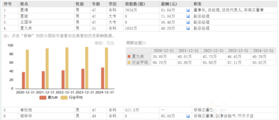 值得一提的是,夏九林是副总经理中唯一持有公司股份的。截至目前,夏九林共持有公司股份1035万股,按2024年年度权益分派实施公告中,每10股派送现金红利人民币3.60元(含税)计算,夏九林可获得薪酬375.6万元,比他去年的薪酬高不少。