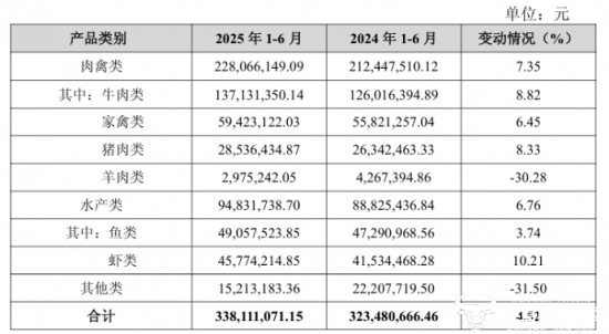 从产品来看,味知香产品分为肉禽类、水产类、其他类三大类别,其中肉禽类实现营收2.28亿元,同比增长7.35%,既是营收主力,又是主要增长动力。而肉禽类中牛肉类、家禽类、猪肉类分别实现营收1.37亿元、5942.31万元、2853.64万元,均实现同比增长,只有羊肉类相较于去年同期下降30.28%,至2975.24万元。