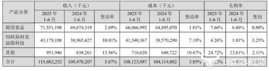 从产品来看,今年上半年,金龙鱼的核心业务厨房食品业务收入达715.51亿元,同比增长2.69%,占总收入的61.8%,毛利率同比提升0.8个百分点至7.66%,仍为公司营收主力,饲料原料及油脂科技业务实现收入431.8亿元,同比增长10.81%,毛利率同比增长3.25个百分点至4.26%,销量和毛利率增速更显著。