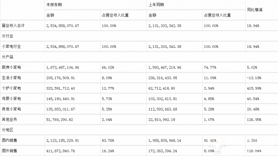 从产品结构来看,个护小家电业务表现尤为突出,销售收入从去年同期的0.63亿元大幅提升至3.24亿元,同比增长415.99%;作为传统支柱品类的厨房小家电实现收入16.73亿元,同比增长5.02%,略高于上年同期的15.93亿元。