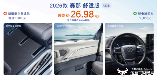 赛那主打“豪华不分级别”。入门焕新价26.98万元起。并新增“四驱臻享版”,将雷克萨斯LM同款头等舱座椅与E-FOUR电子四驱合并推出;头等舱座椅融合16点气动按摩、三档通风加热,采用半苯胺奢华真皮材质,上下车扶手升级打孔皮革包覆及镀铬装饰。新增赛铂金外观、醇厚棕内饰、“羽翼”迎宾灯、PVM全景监控系统+透明底盘功能。静谧性更媲美顶级豪车,120km/h时速下车内噪音低至61.8分贝。2026款赛那做到了“30万级定价,百万级体验”。“四驱臻享版”最终焕新价33.98万元。