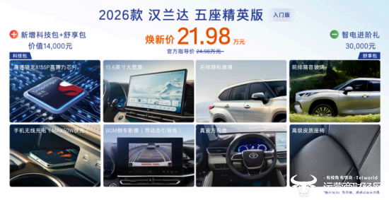 汉兰达“入门即超配”。入门焕新价21.98万元起。全新15.6英寸大屏、高通8155车规级芯片、真皮方向盘、皮质座椅、前后排隔音玻璃、50W高功率无线快充等十余项配置悉数标配,并新增透明底盘功能。于用户而言,不做豪华与科技的取舍,或许就是最大的诚意。