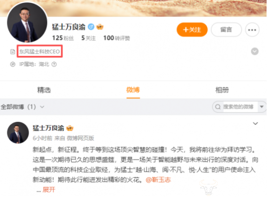9月22日,东风猛士科技万良渝在微博平台发布了第一条动态,透露他当日将前往华为拜访学习,引起了不小的关注。运营商财经网注意到,其微博认证为“东风猛士科技CEO”,这意味着他接替了曹东杰原来的职务,实现升职。