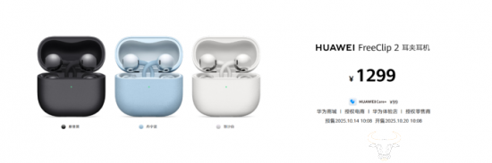 华为FreeClip 2 耳夹耳机2025年10月14日10:08开启预售,10月20日10:08正式开售,首发价格1299元,用户可登陆华为商城及各大授权电商平台或前往华为体验店、华为授权零售门店进行购买。