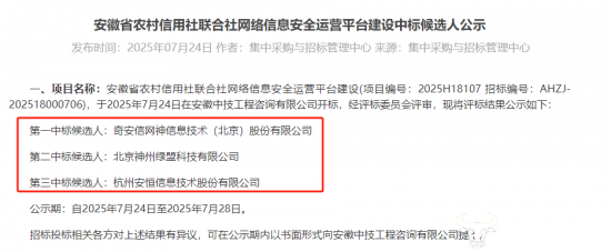 第一中标候选人是奇安信网神信息技术(北京)股份有限公司;第二中标候选人是北京神州绿盟科技有限公司;第三中标候选人是杭州安恒信息技术股份有限公司。