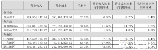 从产品来看,今年上半年,煌上煌的核心产品酱卤肉制品营业收入为6.17亿元,相较于去年同期下降11.65%,毛利率则提升2.23个百分点至38.61%,米制品业务营业收入为3.12亿元,同比微降1.36%,毛利率由去年同期的25.98%下降至21.92%,减少了4.06个百分点。