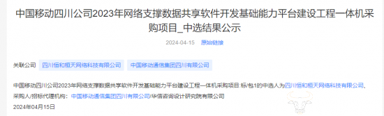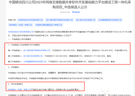 天眼查信息显示,2024年4月9日,四川移动2023年网络支撑数据共享软件开发基础能力平台建设工程一体机采购项目公示中标候选人,第一至第三中标候选人分别为四川恒和桓天网络科技有限公司、四川帕沃科技有限公司、北京睿通森阳科技有限公司,三家不含税报价分别为156万元、152万元、158.32万元;而神州数码(中国)有限公司不满足比选文件第六章否决一览表中的“企业资质”要求被否决应答。