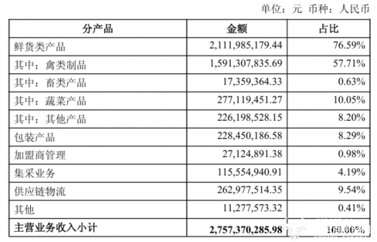 而鲜货类产品终的核心品类禽类制品收入为15.91亿元,同比减少20.79%,蔬菜产品收入为2.77亿元,同比减少11.56%,畜类产品和其他产品分别收入1735.94万元、2.26亿元。