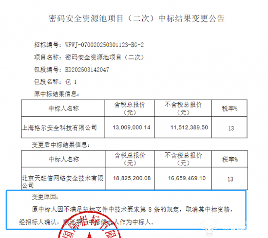 变更原因显示,原中标人因不满足招标文件中技术要求第8条的规定,取消其中标资格,经招标人确认,顺延第二中标候选人也就是上海格尔安全科技有限公司作为中标人。