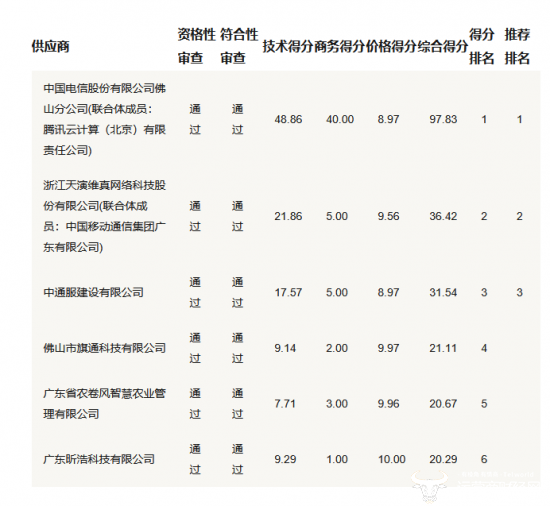 具体来看,佛山电信和腾讯云联合体技术得分为48.86、商务得分40、价格得分8.97;而浙江天眼和广东移动联合体技术得分21.86、商务得分5、价格得分9.56。佛山电信联合体在技术得分和商务得分方面建立了很大优势。
