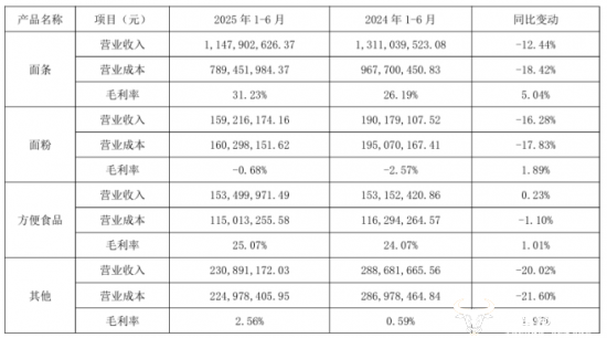 从产品来看,今年上半年,公司三大产品系列中,只有以五谷道场为代表品牌的方便食品实现同比正增长,其他系列均有所下降。具体来看,方便食品实现收入1.53亿元,同比微增0.23%,成为主要增长动力,核心产品面条收入为11.48亿元,同比下降12.44%,面粉收入为1.59亿元,同比下降16.28%。