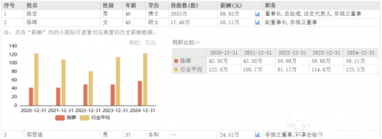 而在去年公司净利润大幅上涨的背景下,公司高管薪酬也纷纷上涨。陈晖去年薪酬为58.11万元,相较于2023年的50.00万元,增长了8.11万元,仅次于董事长陈宏。陈宏薪酬由2023年的43.92万元上调至2024年的69.93万元,增长了26.01万元,此前已连续四年薪酬保持43.92万元不变。