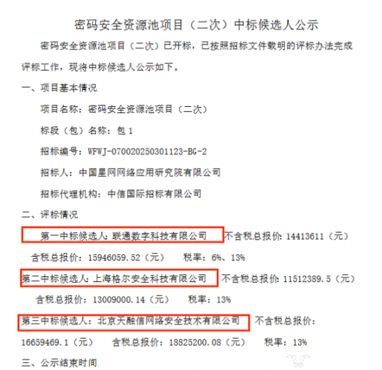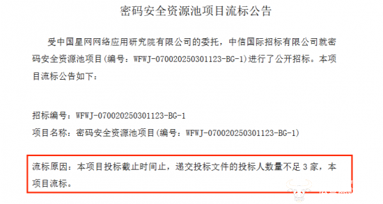 据了解,项目全称为“密码安全资源池项目”,于今年4月7日启动公开招标,招标人为中国星网网络应用研究院有限公司。