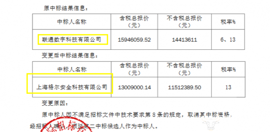然而两个月后,项目竟然连续两个月发布了两个中标结果变更公告,第一次是在8月11日,中标人由联通某子公司(原第一中标候选人)变更为上海格尔(原第二中标候选人);第二次是在9月19日,中标人由上海格尔(原第二中标候选人)变更为北京天融信(原第三中标候选人)。变更原因完全相同,都是因为原中标人不满足招标文件中技术要求第8条的规定,因此顺延。