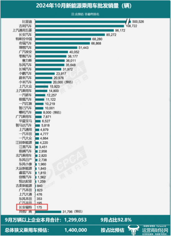 据悉,在乘联会披露的2024年10月新能源乘用车厂商批发销量中,长安福特当月的批发量仅175辆,在上榜厂商中排名倒数,并且在这之后,这份名单中再也没出现过长安福特的名字,应该是被归结到了其他厂商中。