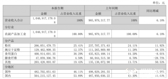 从产品来看,今年上半年,公司四大产品系列中,核心产品粉丝实现收入2.66亿元,同比增长11.92%,豌豆干淀粉收入为1.29亿元,同比增长16.35%,成为主要增长动力,两大产品系列实现了正向增长。而食用蛋白和膳食纤维收入分别为4.01亿元、4705.93万元,分别下降8.01%和28.75%。