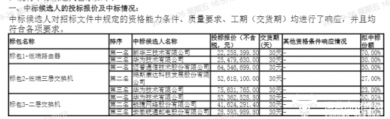 标包1:第一中标候选人为新华三,拟中标份额为70%;第二中标候选人为华为,拟中标份额30%;两者报价差距不大,不含税报价分别为22258399.5元、25479630元。