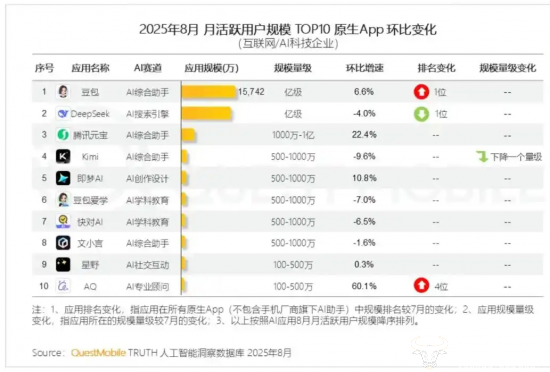 9月16日,据市场研究机构QuestMobile最新发布的2025年8月移动互联网数据显示,豆包的月活数量跃至第一,超越了deepseek,不过,该数据无法得到证实。运营商财经网将梳理具体情况。