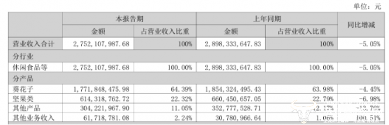 从产品来看,今年上半年,公司两大产品系列均呈下降态势,其中核心产品葵花子收入为17.72,占总营收的64.39%,仍为公司营收主力,但相较于去年同期,微降4.45%,坚果类产品收入为6.14亿元,同比下降6.98%,营收占比为22.32%。