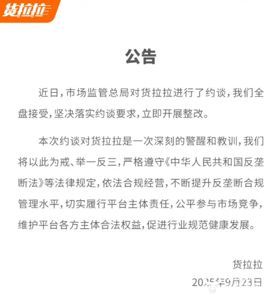 9月23日,国家市场监管总局发布公告称运输平台货拉拉被约谈。根据公告,市场监管总局约谈货拉拉,要求其严格遵守《反垄断法》等法律规定,落实反垄断合规主体责任,及时规范经营行为,公平参与市场竞争,维护货车司机、消费者等相关主体合法权益,推动平台规则和算法公平公正、公开透明,促进行业规范健康发展。