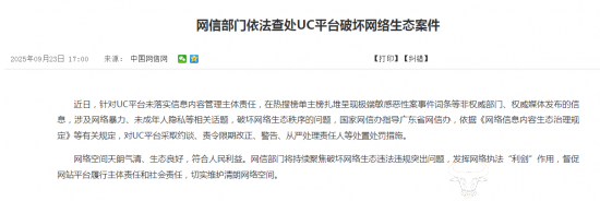 9月23日,UC平台因存在未落实信息内容管理主体责任,在热搜榜单主榜扎堆呈现极端敏感恶性案事件词条等非权威部门、权威媒体发布的信息,涉及网络暴力、未成年人隐私等相关话题,破坏网络生态秩序的问题,有关部门对UC平台采取约谈、责令限期改正、警告、从严处理责任人等处置处罚措施。