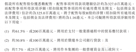 据百果园发的公告,公司与配售代理签订配售协议,将以每股1.17港元的价格发行2.795亿股H股。预计此次配售将筹集总款项约3.27亿港元,净所得款项约3.25亿港元。其中,约61.5%用于支付贸易应付款项,约30.8%用于偿还银行贷款,约7.7%用于一般营运资金及行政开支。这也意味着,此次募集的资金超九成用于偿还贸易应付款和银行贷款。