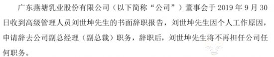燕塘乳业公告显示,吴乘云因个人工作调动辞去公司副总经理职务,同时聘任刘世坤为新任副总经理。而在2019年,刘世坤曾辞去燕塘乳业副总经理一职。