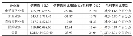 而良品铺子在财报中表示,公司销售模式以线下门店为核心,采取“直营+加盟”的双轨模式,但今年上半年,公司线下渠道全面承压。直营零售业务上半年收入为3.48亿元,同比下降19.65%,加盟业务收入则同比下降31.87%至3.46亿元,两种渠道收入均有所下降。与此同时,门店规模也进一步收缩,由报告期初的2581家门店减少至报告期末的2445家,净闭店了136家门店。
