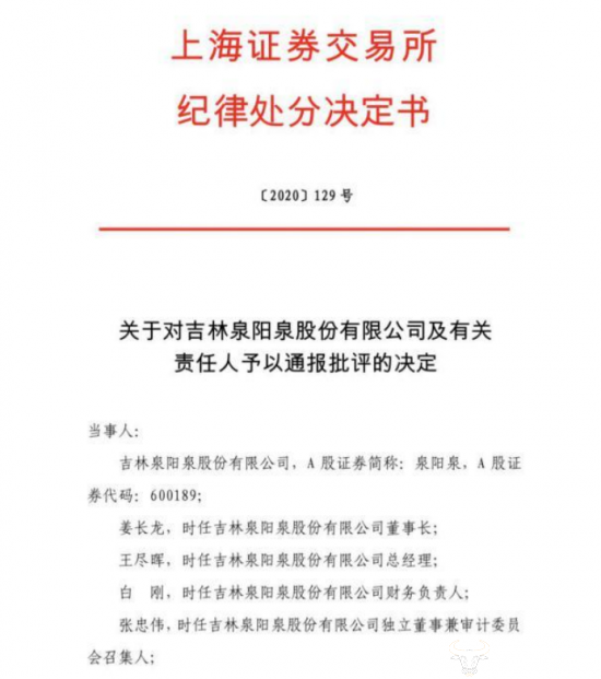 处罚决定书显示,原因之一是泉阳泉预告的2019年年度业绩与实际业绩相比,出现重大偏差,归属于上市公司股东的净利润差异金额高达10.95亿元,差异幅度达280.77%。同时,还未及时对业绩预告进行更正,迟至2020年6月24日才发布业绩更正公告,更正信息披露不及时。