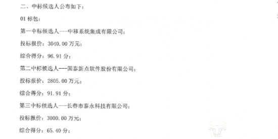 第一中标候选人:中移系统集成有限公司,投标报价3040万元,综合得分96.91分;
