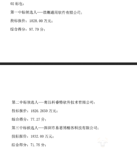 第一中标候选人:浪潮通用软件有限公司,投标报价1828万元,综合得分97.79分;