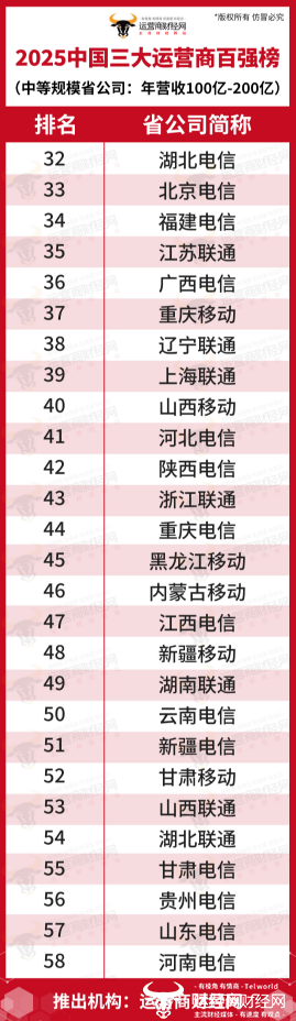 近期,运营商财经网已正式推出了“2025三大运营商省公司百强榜”,并首次按照年营收规模划分了不同的5个等级,其中数量最多的省公司主要是年营收在100亿到200亿元,共计27家,接下来一一揭露。