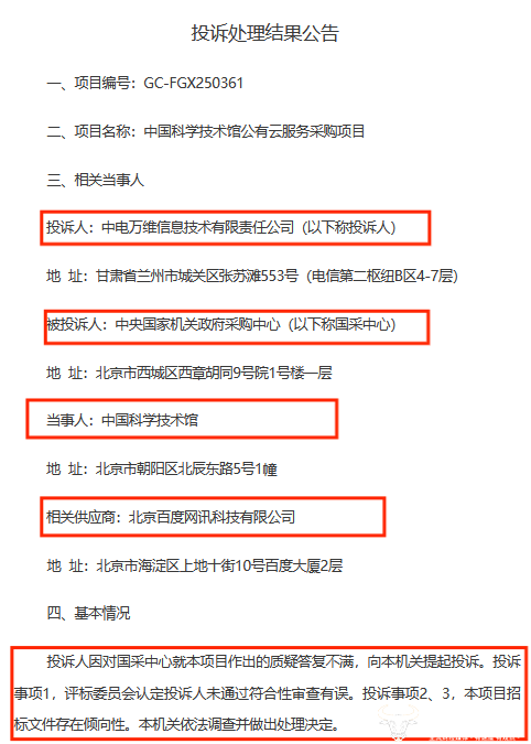 本以为该项目就此结束,没想到9月6日,中电万维信息技术有限责任公司竟然发起了投诉,被投诉人为某采购中心,相关供应商为北京百度网讯科技有限公司。