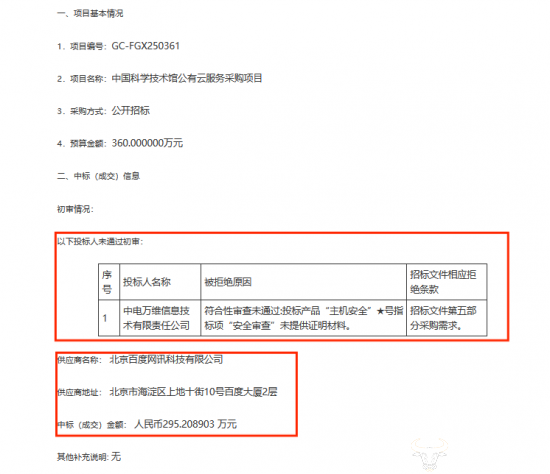 除了百度网讯外,中国电信旗下公司-中电万维信息技术有限责任公司前来参选,不过由于“安全审查”项未提供证明材料没能通过初审。