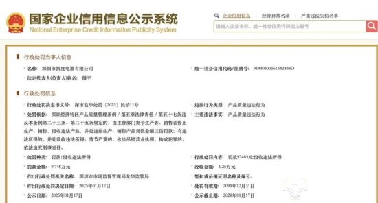 今年1月,凯度电器因产品质量违法行为被深圳市市场监督管理局龙华监管局没收违法所得9.748万元,行政处罚决定书文号为深市监华处罚〔2025〕民治11号。