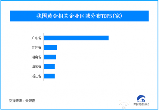 天眼查专业版数据显示,截至目前,我国现存黄金相关的企业有14.2万余家,从地域分布上看,广东省、江苏省、湖南省黄金相关企业数量位居前列,分别拥有3.8万余家、8200余家、7200余家;从成立时间来看,近三成的相关企业成立于5年内,成立于1年内的相关企业占比6.77%。