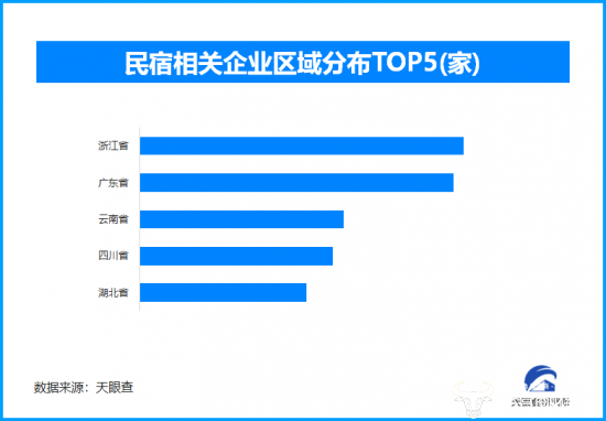 天眼查专业版数据显示,截至目前我国现存在业、存续状态的民宿相关企业超35.6万家。从区域分布来看,浙江省、广东省、云南省民宿相关企业数量位居前列,三个省市数量总和超过10万余家,占企业总数的28.09%。