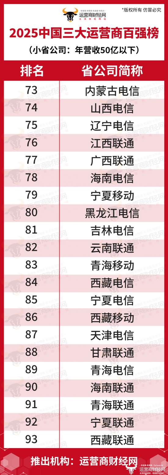 近期,运营商财经网已公布了“2025中国三大运营商百强榜”名单,其中按照年收入规模进行了等级划分,而年收入在50亿元以下的被称为“小省公司”,此次详细揭晓这一等级的省公司都有哪些?