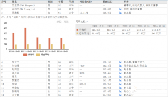 乔海莉2024年薪酬为218.8万元,相较于2023年的212.7万元,增长了6.1万元,在公司十位副总裁当中,薪酬排名第五,比赵国宝低了不少。赵国宝薪酬2024为315.0万元,比乔海莉高了96.2万元。