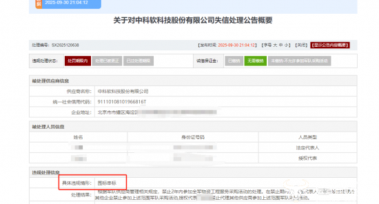 近日,某系统采购网发布《关于对中科软科技股份有限公司失信处理公告》,中科软因围标串标被处罚,具体是什么情况?
