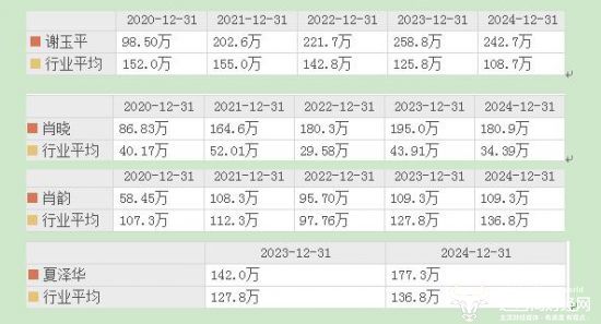 薪酬方面,尽管2024年公司整体业绩表现较好,但多数高管薪酬不升反降。其中,总经理谢玉平2024年薪酬由258.8万元降至242.7万元;财务总监肖晓由195.0万元降至180.9万元。副总肖韵薪酬不变保持为109.3万元,唯有副总经理夏泽华实现涨薪,从142.0万元提高至177.3万元。